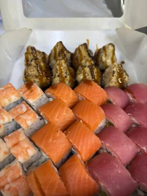 - "Чарлстон": филе лосося, сливочный сыр, филе тунца, лук жареный, огурец - 8 шт.