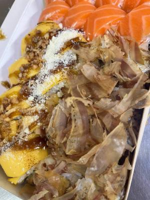 - "Терияки фрай": жареный лосось, такуан, сливочный сыр, омлет Тамаго, панировка - 5 шт.