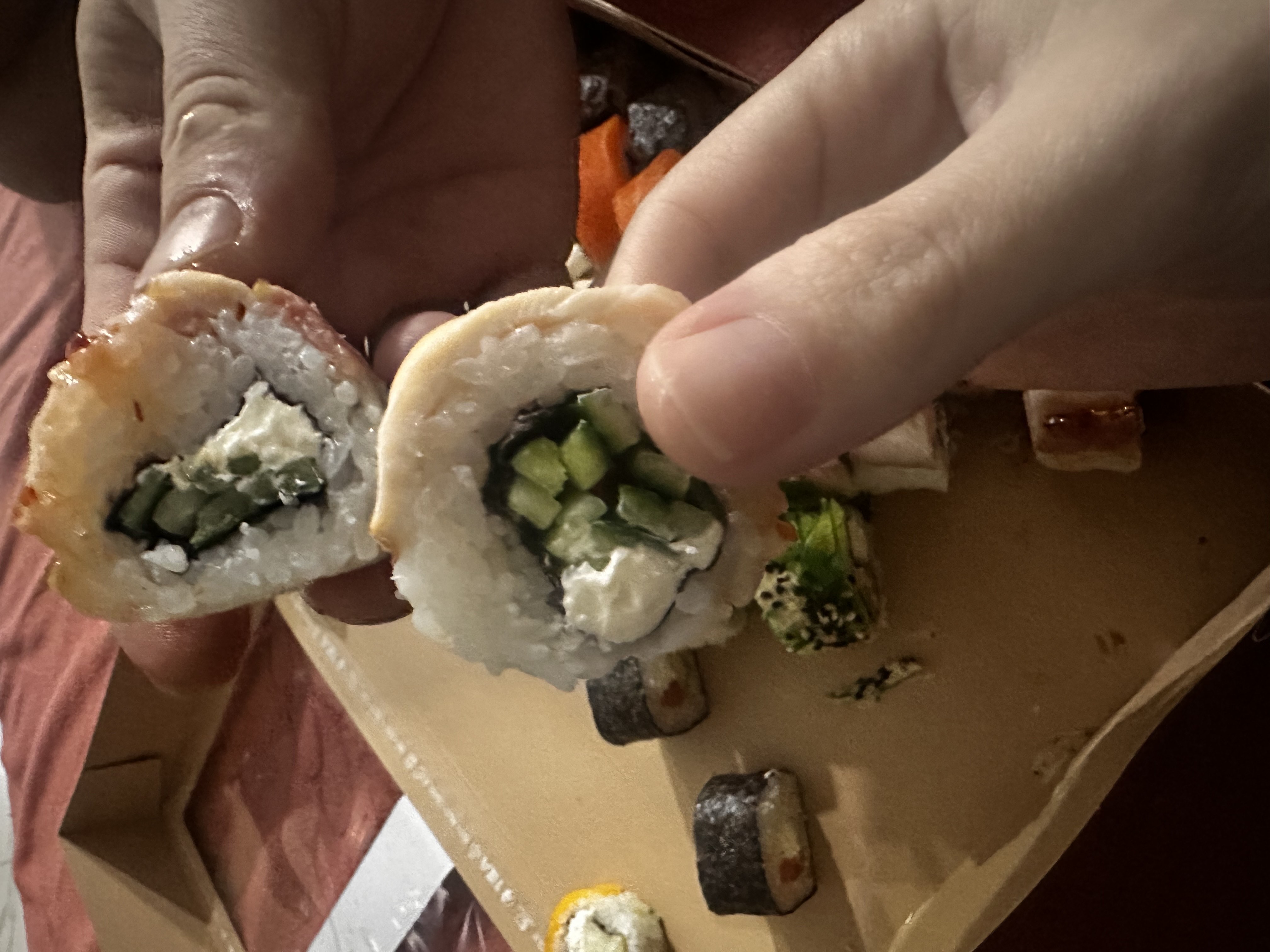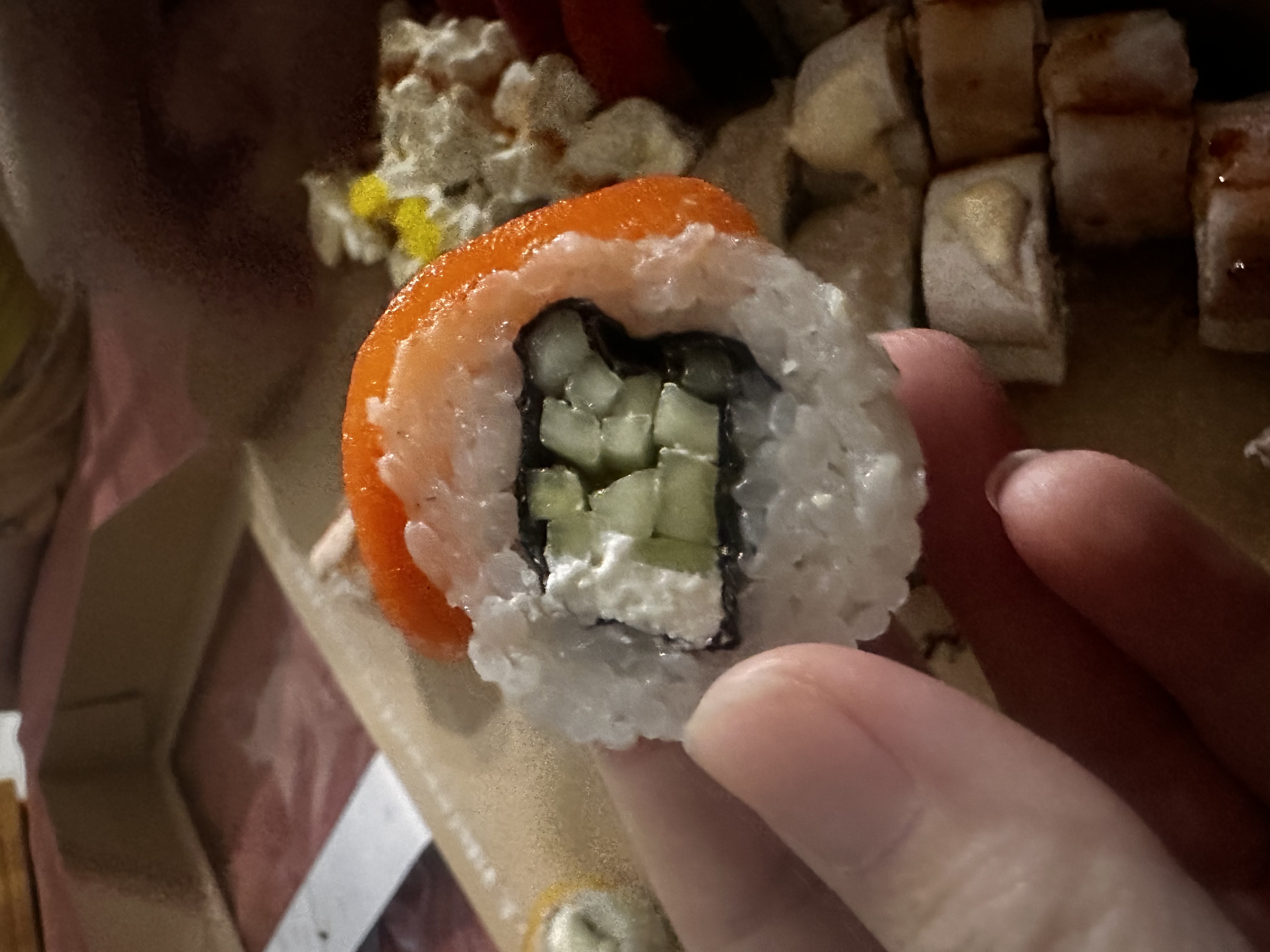 Начинки нет, рис подсохший, нори не жуется, огурцы тухлые. Фу, деньги на ветер. Оочень разочарованы