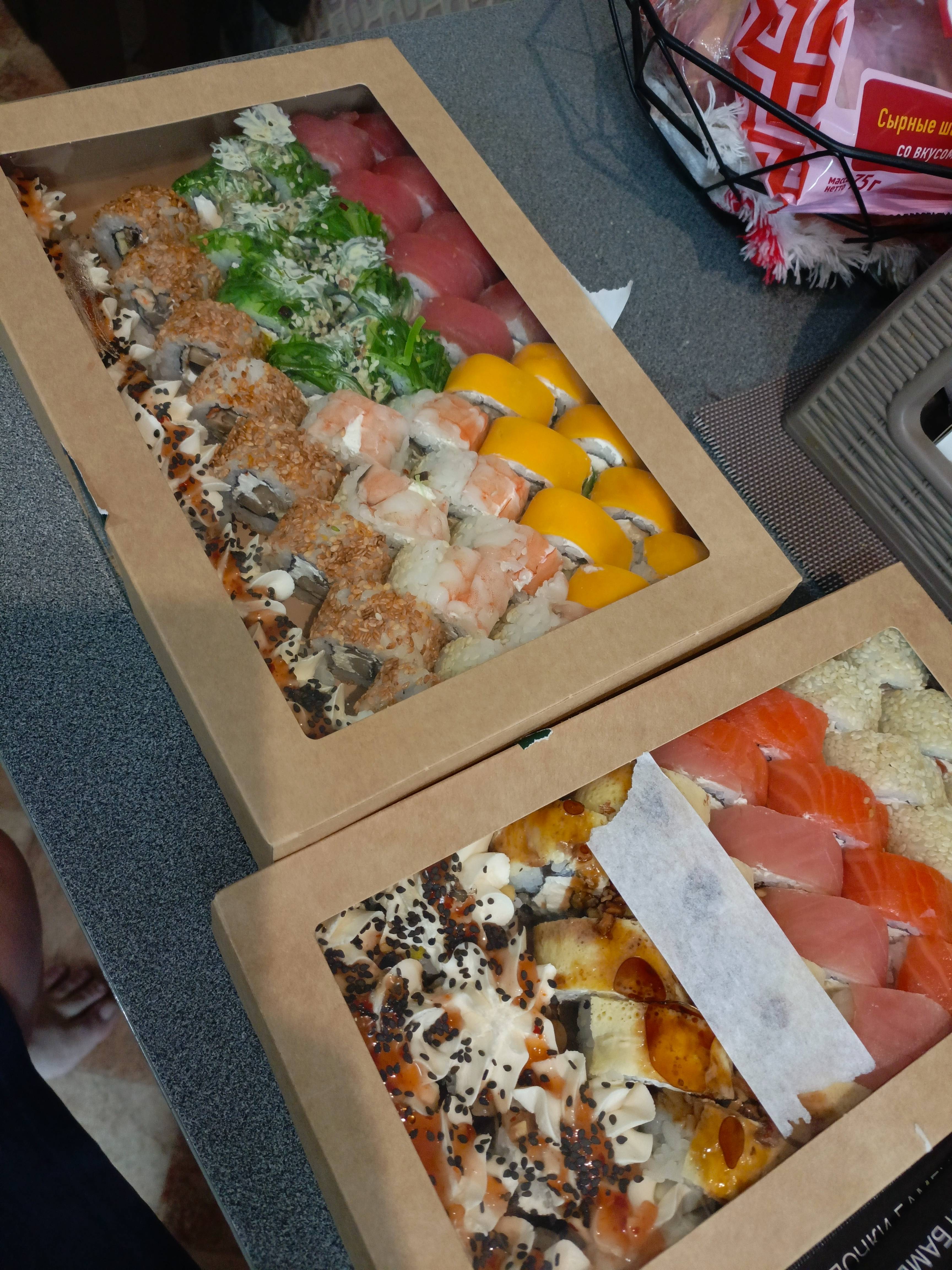 Заказали сет «Мама босс» и хотим сказать, он шикарен! Спасибо! Свежие, большие, много рыбы и сыра- супер!!! Рекомендуем!