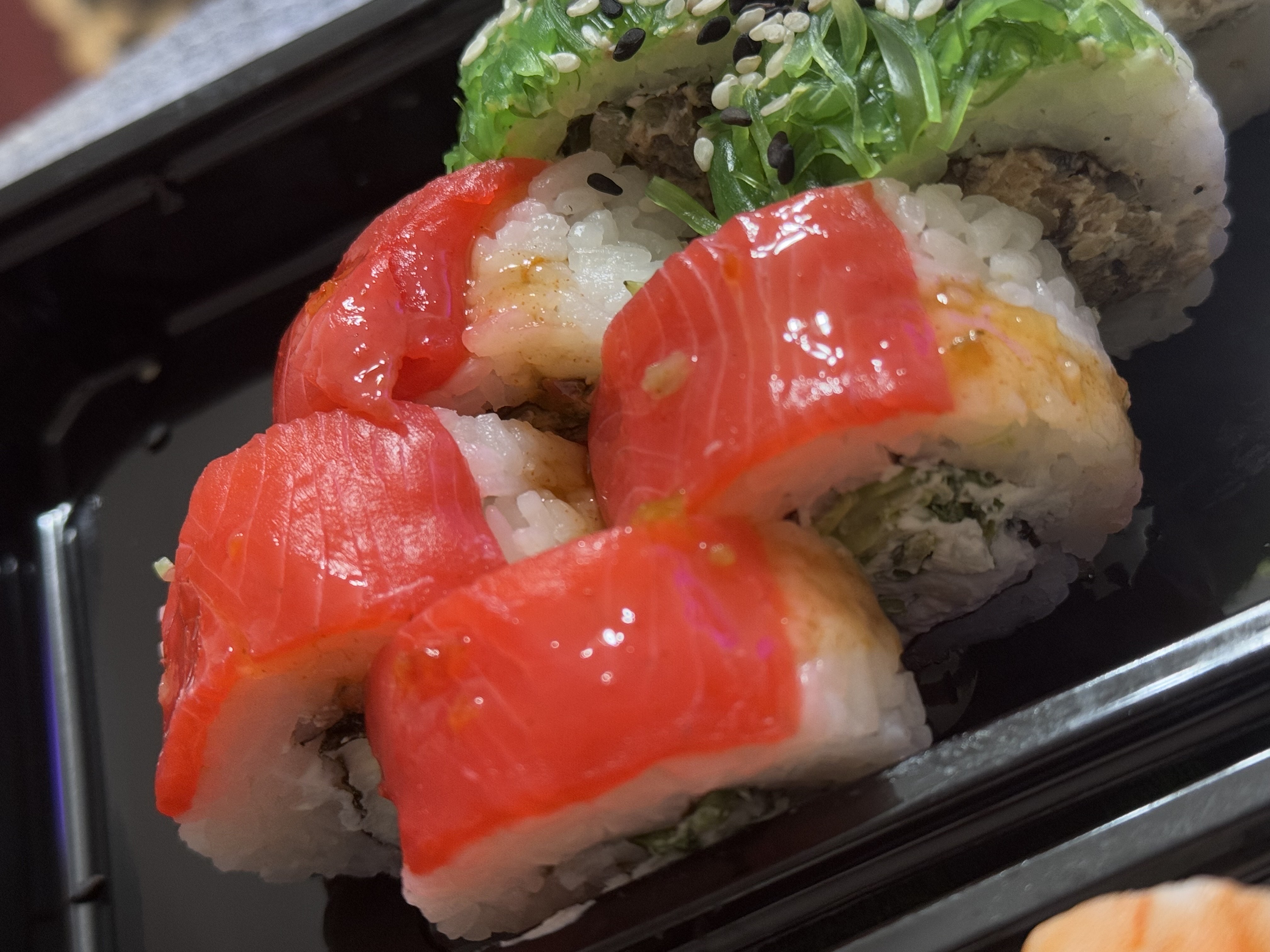 Состав: филе лосося, угорь, креветка тигровая, авокадо, огурец, сыр, рис, нори