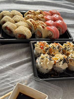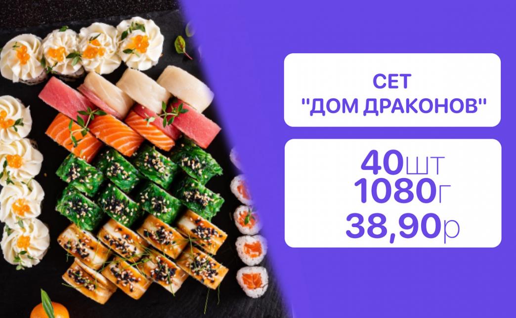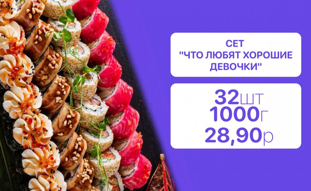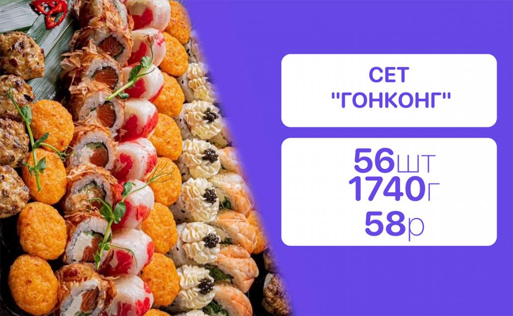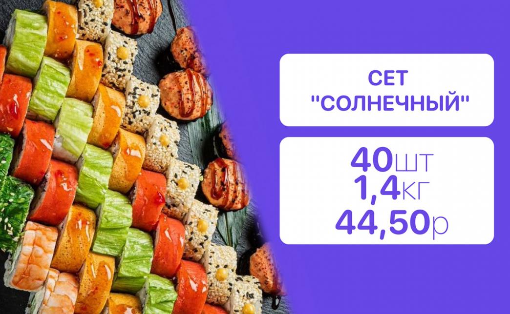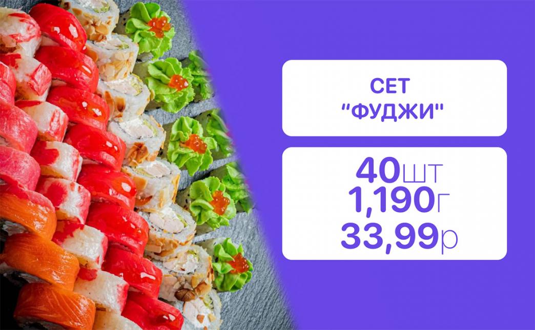 - Стоимость суши-сетов: от 32,90 р. от 58 р.