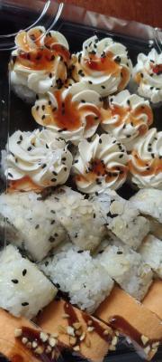 - ролл "Крем-шитаке в японском блинчкике": грибы шиитаке, обжаренные в соусе терияки, крем-чиз, японский блинчик оранж, такуан, соус терияки, арахис, нори, рис - 8 шт.