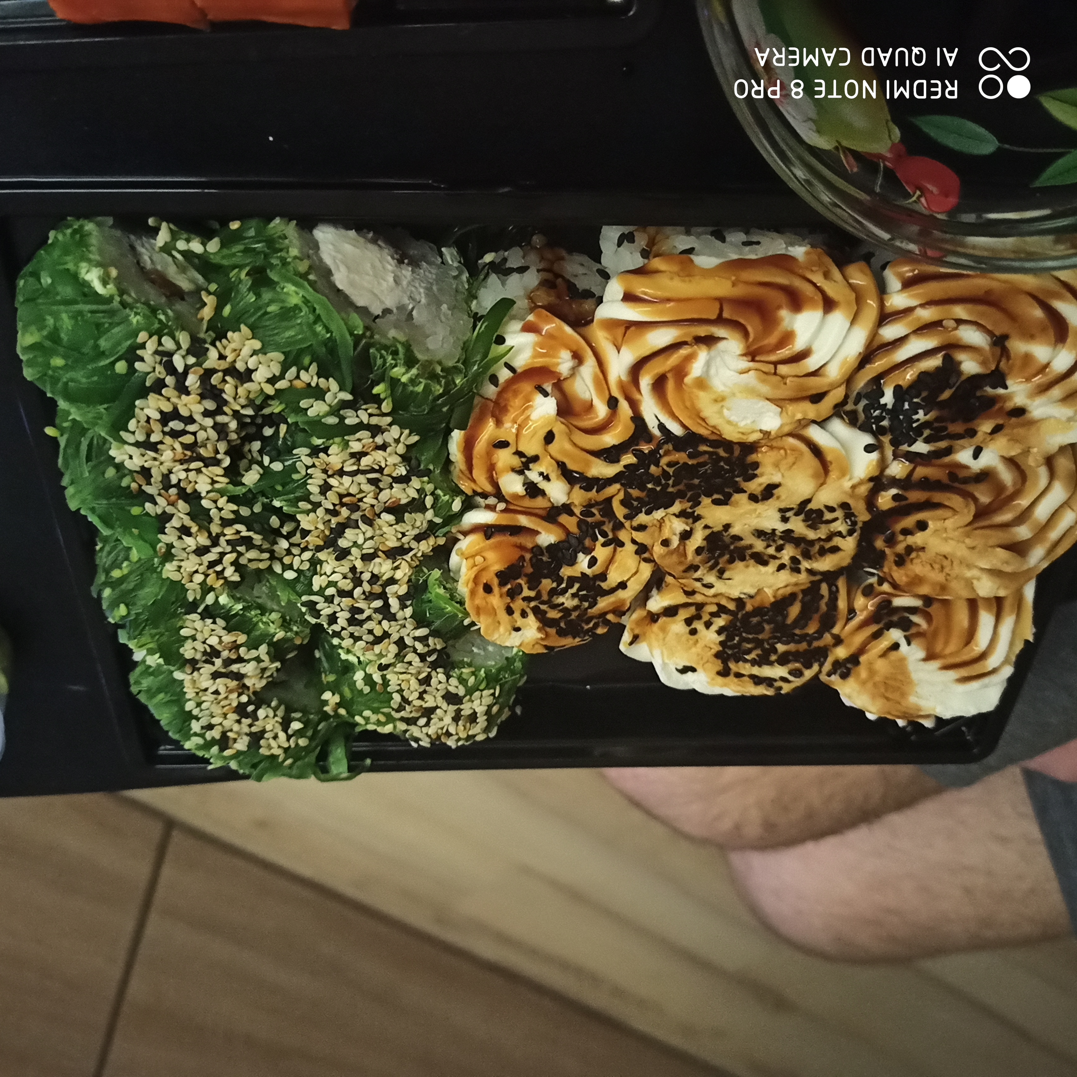 Состав: тунец, такуан, сыр, нори, рис, темпура