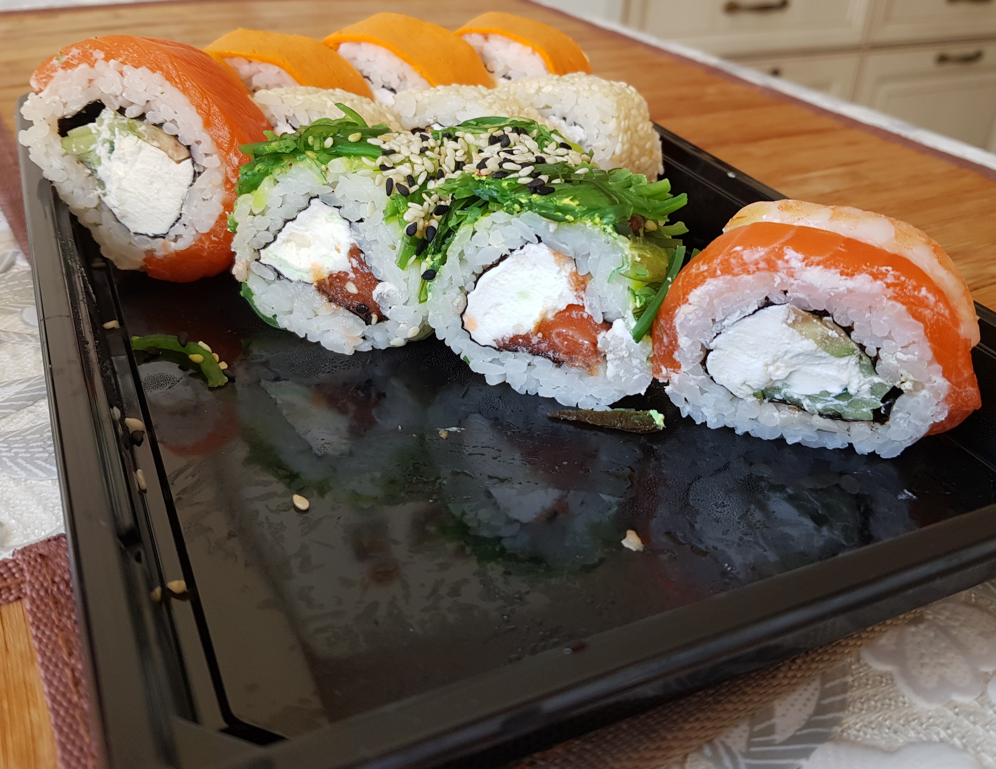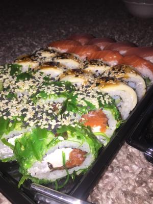 Состав: филе лосося, угорь, креветка тигровая, авокадо, огурец, сыр, рис, нори