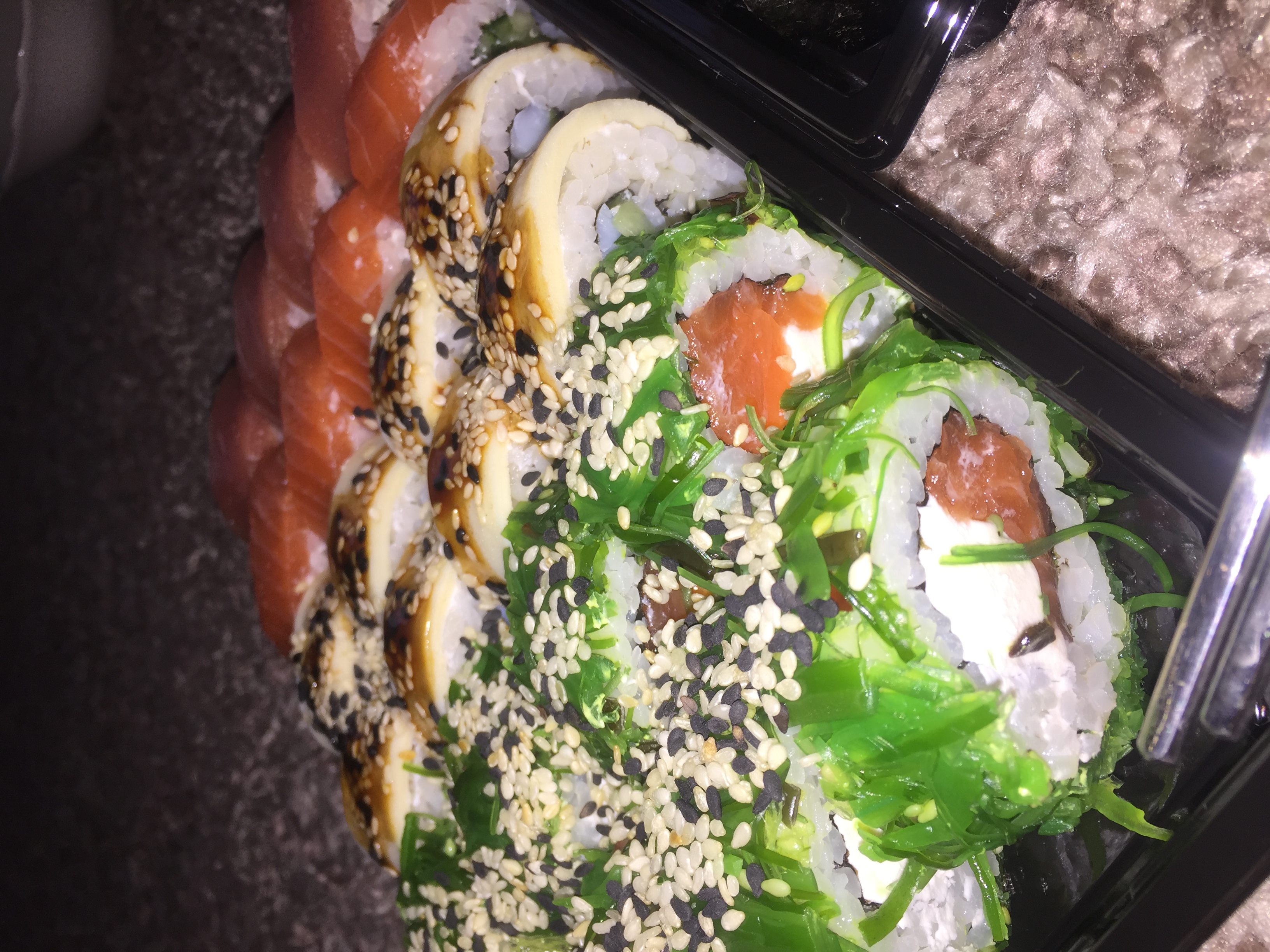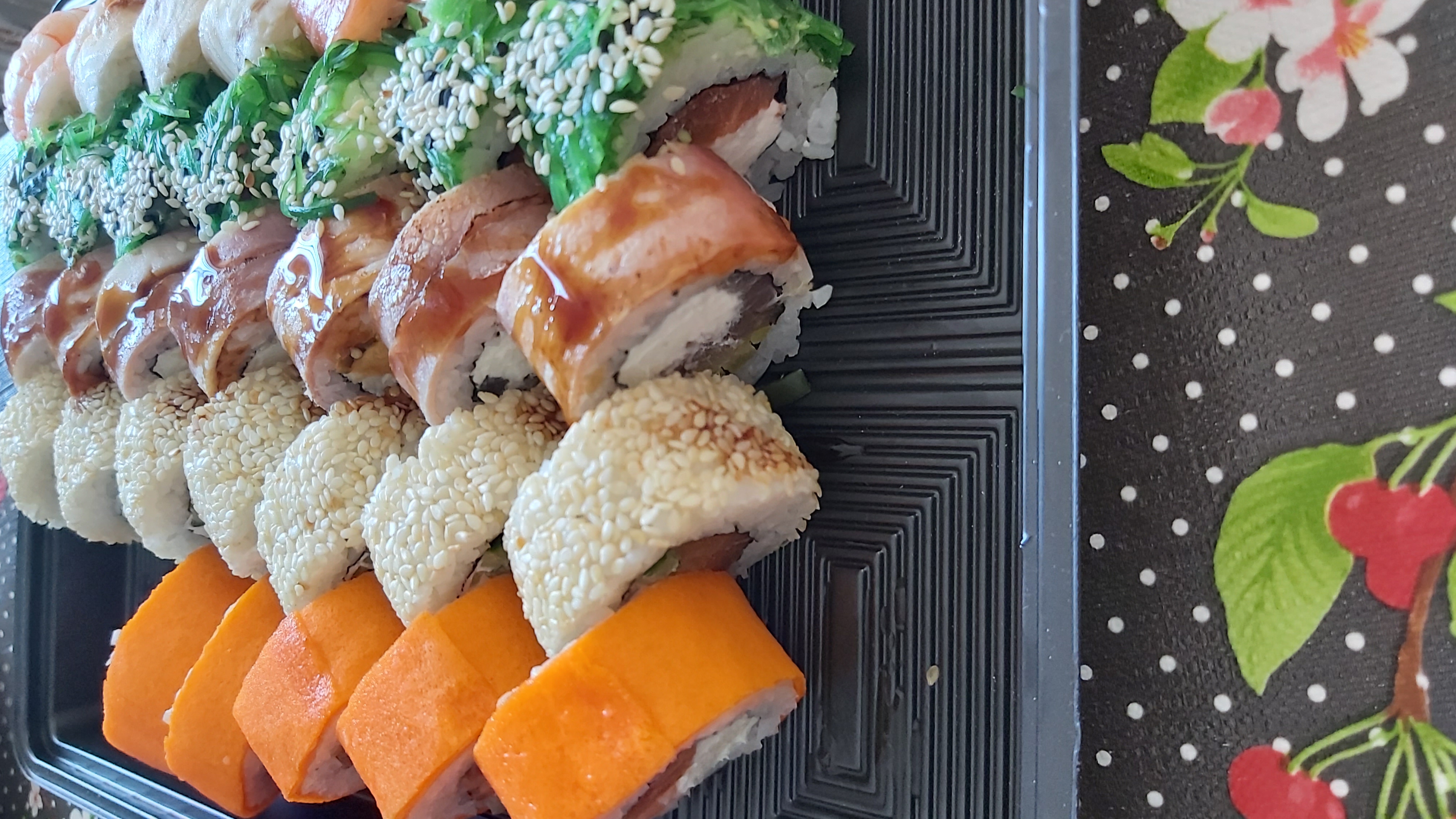 Состав: филе угря, авокадо, огурец, сыр, рис, соус терияки, кунжут