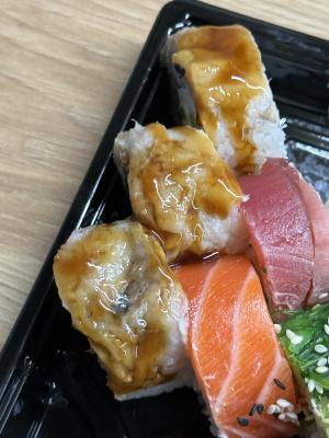 Состав: филе лосося, угорь, креветка тигровая, авокадо, огурец, сыр, рис, нори