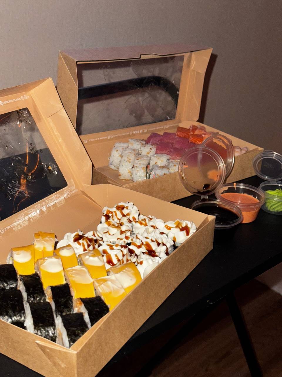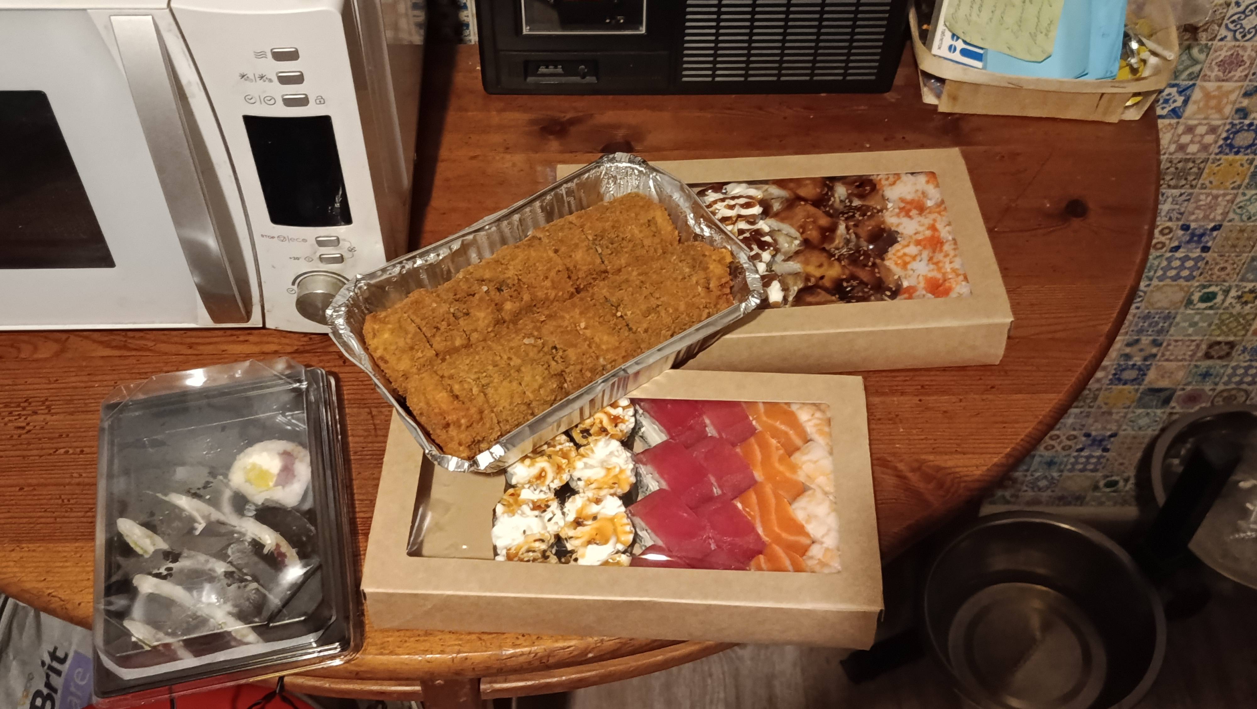 - В теплых ролла крайние кусочки отдаются запечатанными, так как большинству нравится дополнительная панировка на роллах!