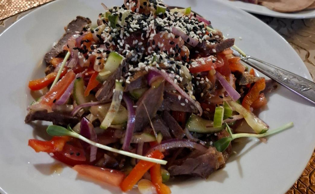 - салат с ростбифом и овощами (180 г): говядина, перец болгарский сладкий, томат, лук репчатый, огурец свежий, чеснок, соевый соус, масло растительное, кунжут