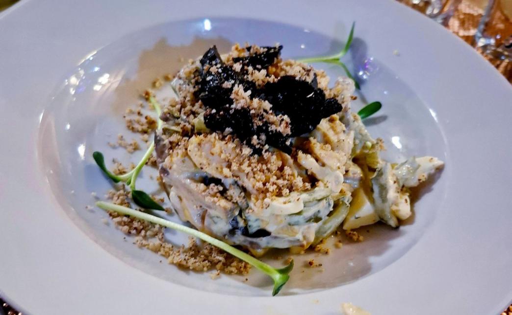- салат "Мечта гурмана" (200 г): куриное филе, шампиньоны, яйцо, огурец маринованный, чернослив, грецкий орех, майонез