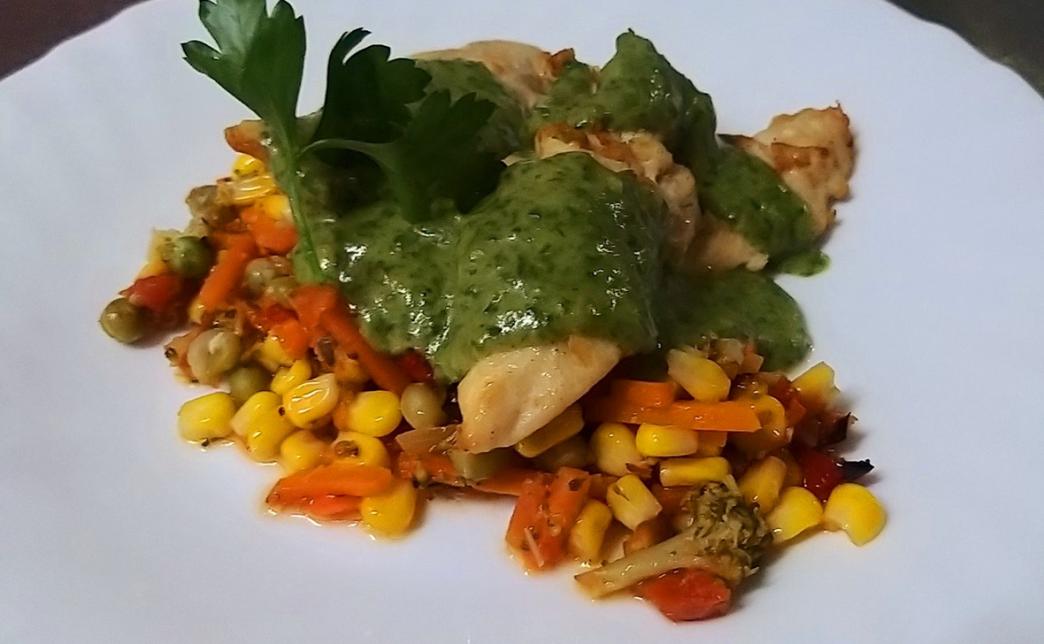 - цыпленок под сливочно-шпинатным соусом с овощным гарниром (180/150 г)