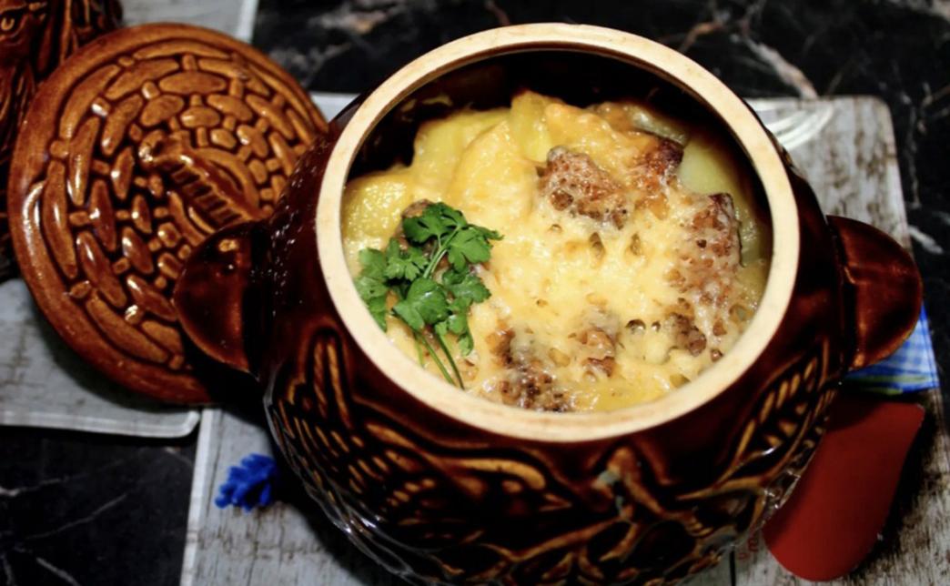 - горшочек "Хуторской" (370 г): свинина, драники, соус сливочно-грибной